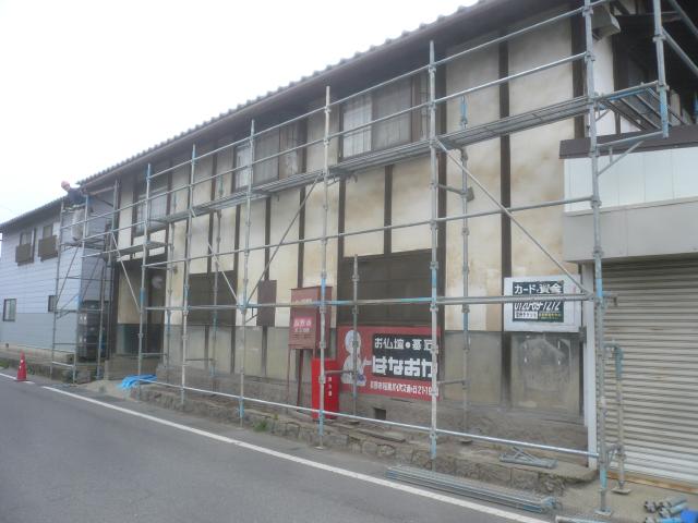 | 前面道路が狭く、車の往来に気を付けながら足場を組みます。 |