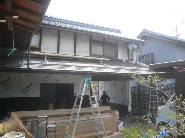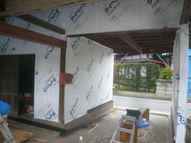 雨が当たるところではないですが、張り替える面は全て透湿シートを張っていきます。 |