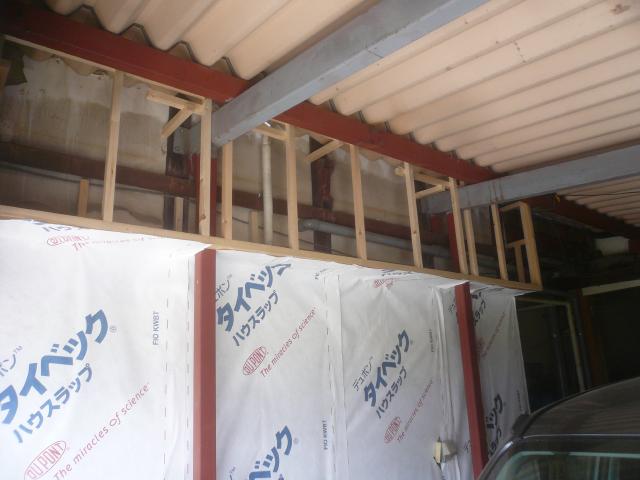 下では板金屋さんが鉄板サイディング張り始め、上で大工さんが下地を組んでいきます。 |