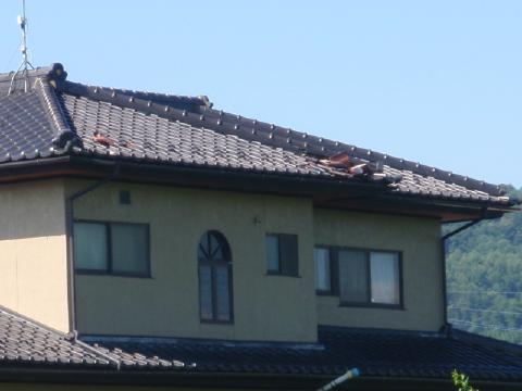 | いやーっ、とにかくすごかった、雨と風が。風呂の窓を閉めようとしたけど、吹き込んだ桃の葉っぱが嵐のように舞っていて、やっとの思いで窓を閉めたよ。キッチンの天井の雨漏りがきっかけで屋根瓦の被害に気が付いたんだけど、屋根に登る事も出来ないし、どんな状況かよく見て調べて欲しい。と言うことでした。 火災保険に入っているので、保険が使えれば?と言う事です。大丈夫ですよ、保険申請用の書類も用意します。 |