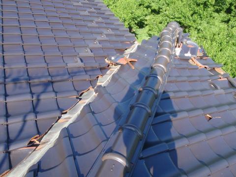 | 夜の内に電話をかけて瓦屋を手配。 早速翌朝行ってみました。見てびっくり、ホントにすごい風だったんだなと実感させられました。実際に飛ばされた瓦は割れたり、雨漏りしたりと目に見える被害なのですが、飛ばされてはいない登り棟瓦もかなり動かされてしまっています。割れたりめくれたりしている瓦は応急修理をして今日のところは終了。 見た目で判断するのではなく、動いてしまった瓦は全て今回積み直した方がいいと思います。それが修理方針のご提案でした。 |