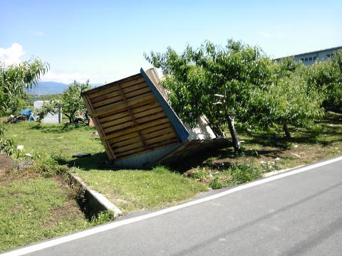 | あっ!物置が転がってる 朝方訪問する途中の風景です。物置が飛ばされていたり、屋根がはげている家はあちこちに有ります。 私の大好きな桃の木もあちこちで倒れてる ![]() |