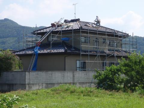 | 2階屋根瓦の被害が大半、ぐるりと足場をかけました。 | まずは棟の解体から、2階の登り棟は全て動いていしまっています | 鼻先の瓦から、なおしていきます。まずは瓦を剥いで、ルーフィングを敷き直して。 |