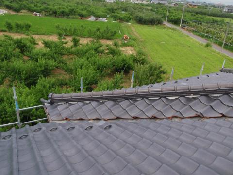 | 瓦工事の完成です。飛ばされたり、割れてしまった瓦は色が違っています。 | ぴしっとしたまっすぐなラインになりました。 | これで完成です。もう雨が降っても大丈夫! |