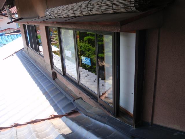 手前が、漬け物小屋、その向こうに母屋があり、その向こうに増築部分が。 | 木製窓を外して、サッシュを入れました。 |