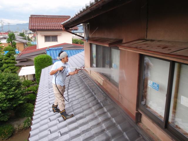 | 手前が新しい建物、シートの部分が増築部分です。今回手前の色に合わせて、全ての壁面を統一した色に変えさせて頂きます。 | 高圧洗浄機で外壁を洗います。 こちらは母屋の赤土色のような壁の色。 |