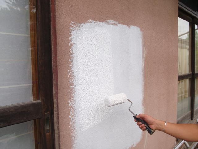 | モルタルひび割れ部分はコーキング。 | まずは下地の補修材の塗装です。マスチックローラーで表面の模様の大きさを作り出します。どの程度の模様がいいか、試し塗りをしています。 | いよいよ塗装開始!まずは下地の補修から。化粧で言うファンデーションの様な物です。外壁の細かなひび割れやくぼみを処理します。 |