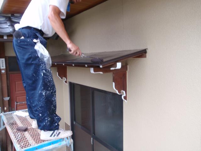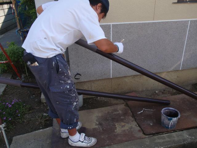 | 庇や水切りなど鉄板部分や、木部の塗装もします。 | 予定に無かった雨樋も塗装しておきます。 廻りが新しくなると、古かった物はよりいっそう古くみえてしまうから塗り替えます。 |