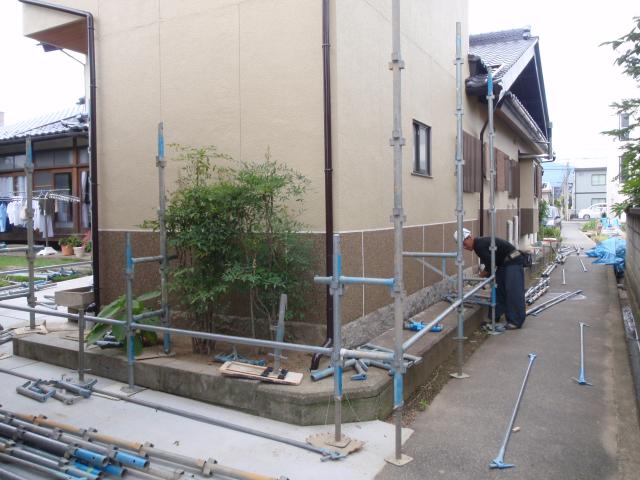 | 仮設足場の設置です。 路地側の人が通る部分はシートを貼り養生します。 |