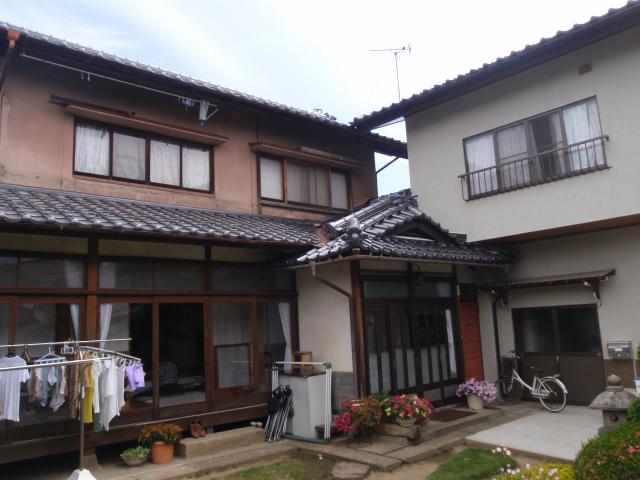 | 左が母屋と、右が増築部分です。当初は左側部分だけの予定でしたが。 | 裏からみたお屋敷の状況です。北側に突き出た漬け物小屋も塗装をします。 | 2階の窓は昔ながらの、木製の窓です。 アルミサッシュを入れる予定です。 |