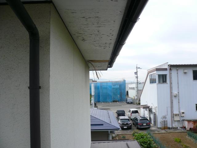 | 二階の軒天井がはげているのがわかりますか? | アップしてみました。 | 近くで見ると、軒天井の合板全体にヒビ割れと、はがれが見られます。 |