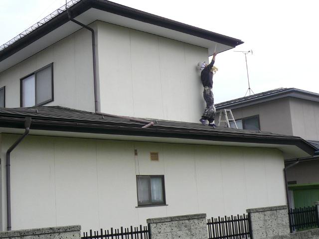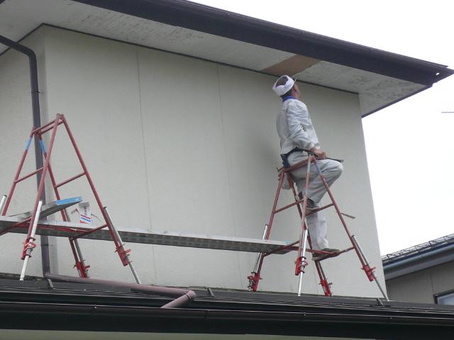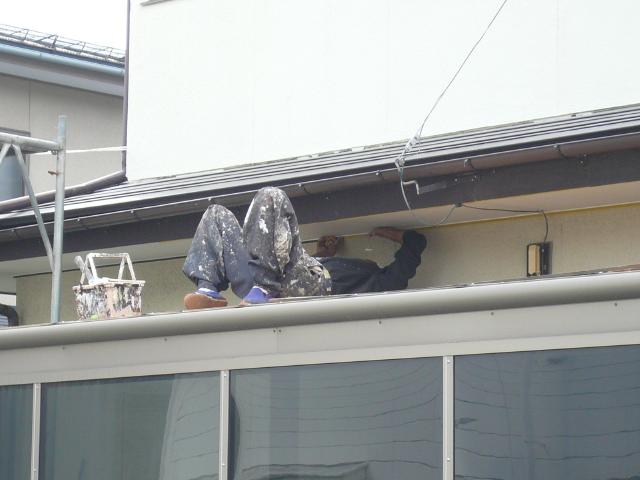 | 狭いところに潜り込んで造作をする大工さん。 | 大工さんが終わると塗装工事に入ります。潜り込んで塗装をしています。 | 軒天ボードが貼り終わると塗装工事です。 |
