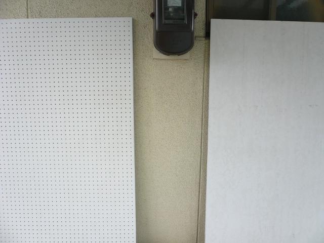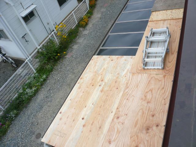 | 平ボードと有孔ボードを使います。有孔ボードは換気口の役目をします。 | 一階の部分にはカーポートや下屋がたくさん付いています。 | カーポートの上は歩けないので、合板を敷き詰めて足場にします。 |