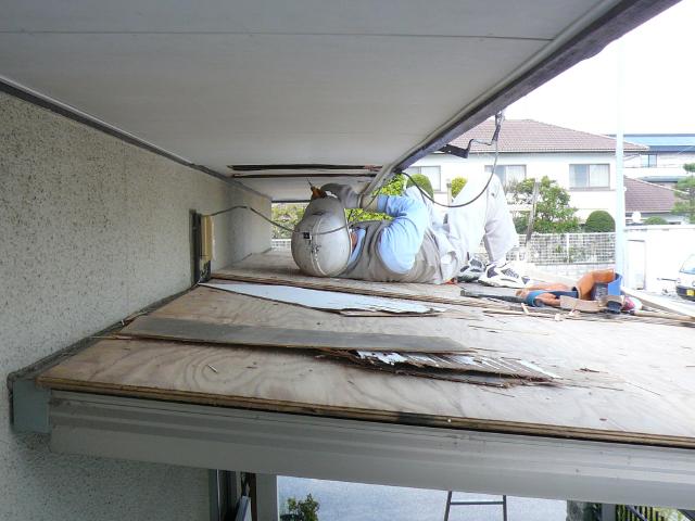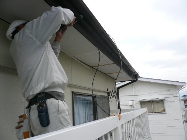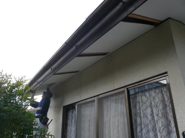 O様は、今夏の台風ではがれて垂れ下がってしまった二階部分の軒天井が、外から見るととても見苦しくなってしまい、どうしたものか考えていました。そんな時、以前弊社のホームページからリフォームのご注文をいただいたお客様からご紹介いただき、初めてご縁をもたせていただきました。 現調してみると、はがれてしまった部分だけでなく他の部分もはがれやすくなっていて、軒天井全体を改修したほうがいいということをお伝えして、リフォームすることになりました。 |