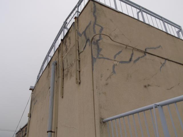 パラペットのコーナー部分もヒビが入り離れてしまっています。 |