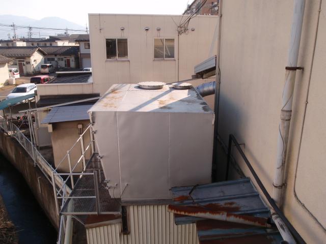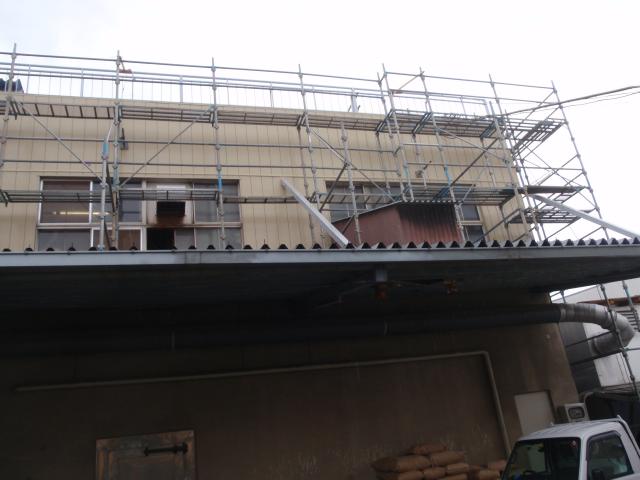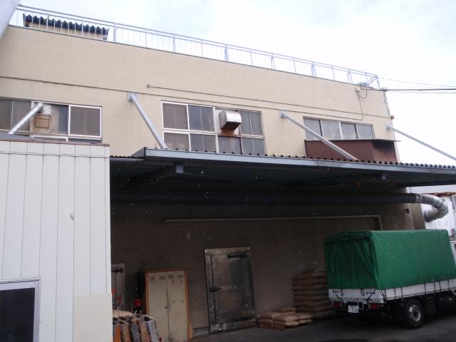| 工場の外壁モルタルがはがれ落ちてしまう。もしそうなれば、下にある集塵機に穴が空いて壊れてしまい、工場がストップしてしまう。修理には最低でも10日以上、実際どのくらいかかるか解らないので死活問題であるとのことでした。 とりあえず集塵機を防御して、暖かくなったら、外壁を落として、塗り直してほしいという事でありました。 |