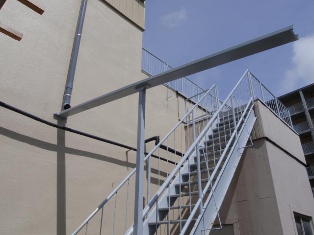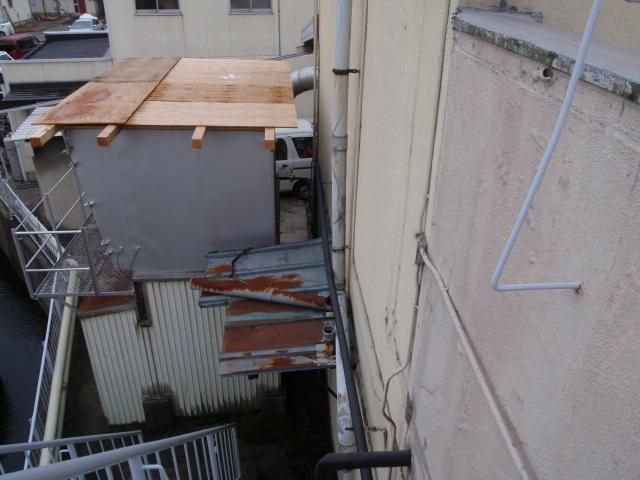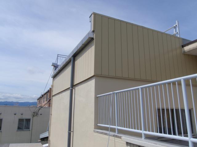 | 完成です、綺麗に壁を塗装して、側溝に直接落とすように、橋形の雨樋を付けました。 | 集塵機の上の養生は万が一を考えて、そのままにしておくことにしました。 | パラペット上下の部分はサイディングで覆い、下の部分は、シリコン塗装で綺麗に仕上げ、完成です。 |