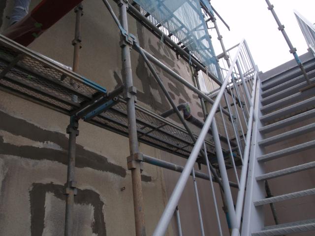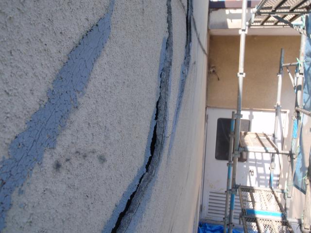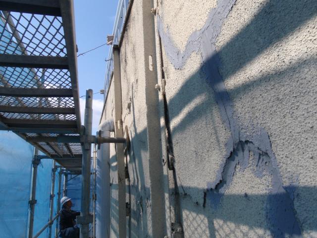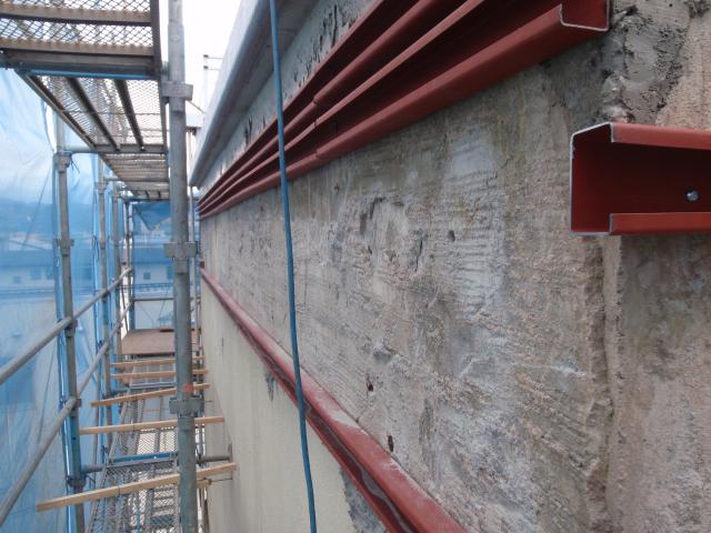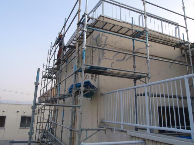| 屋上パラペットが傾いているように見えるので、躯体の被害がどれくらいか見てみたい。とりあえず、足場を掛け、浮き上がっているモルタルを撤去してみないと解りませんが、塗り直しの方向で、とりあえず躯体の状況をみて判断しましょう。と言うことで工事を始めました。 |