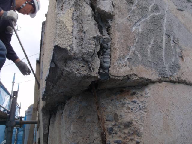 | 今にも剥がれて落ちそうなくらい浮き上がっています。 | モルタルを斫り取ると、大変です。 パラペット部分が押し出され、今にも落っこちそう 鉄筋も入ってはいますが、錆びて伸びきっていて効果は有りません。 |