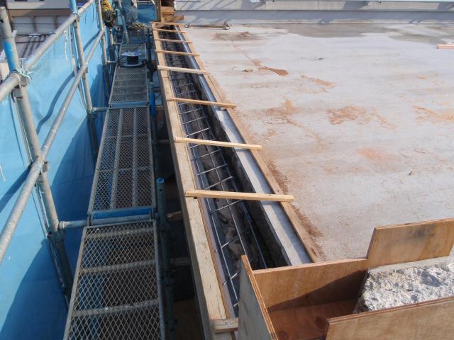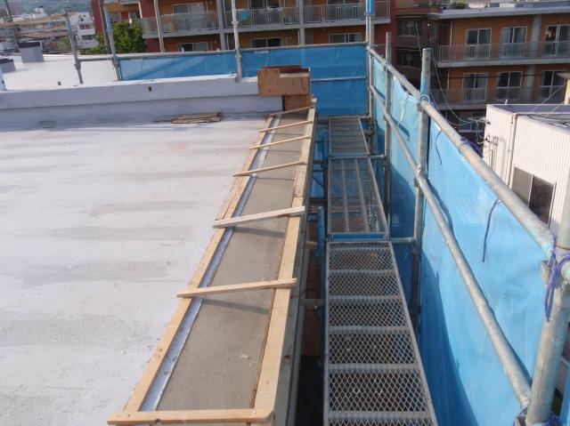 | コンクリート打設 屋上までコンクリートを運ぶのは大変です。 | コンクリートが固まるのを3~4日ほど待ちます。 | 型枠を外して、FRP防水を掛けます。 |