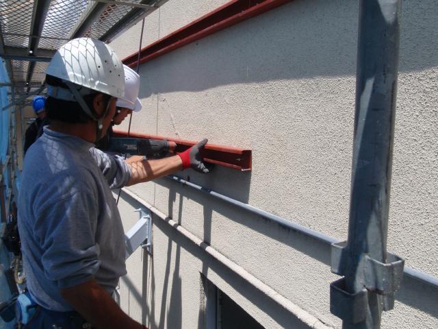| 工事予定にはなかった、南側の壁面も足場を掛けカバー工法で工事をすることに。 | 40年以上持っている壁です。モルタル面から雨がしみこまないように、鉄骨下地をアンカーで躯体に止め、サイディングで壁を仕上げます。 | モルタルを塗り直す予定だった壁も、同じようにサイディングで仕上げていきます。 |