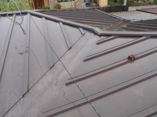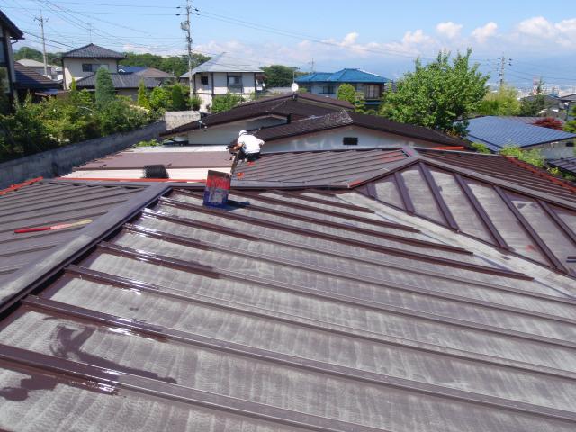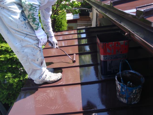 | 次に、瓦棒など立上り部分の塗装の入りづらい場所を先に塗装します。 | その後で、平らな面をローラーで塗り仕上げます。 | 平屋なので、屋根の面積は結構あります。 |