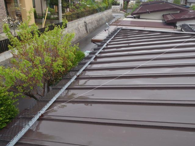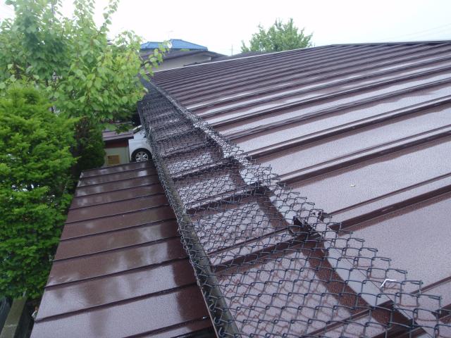 | 施工前の状況。丁度雨が降っていたのできれいに見えますが、濡れていても白っぽく下地が見えなじめています。 | 勾配の緩い平屋の屋根、日当たりの強い南側の面の方が傷みが早いようです。 | 北側の軒先には、雪止めのネットフェンスが張られています。これも一旦取り外して塗装をします。 |