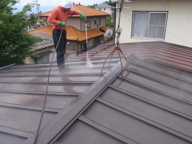 これほどはっきりと色が落ちるのは珍しい。 高圧洗浄機で洗い流すと粉状になった塗装の膜が洗い落とされます。 |