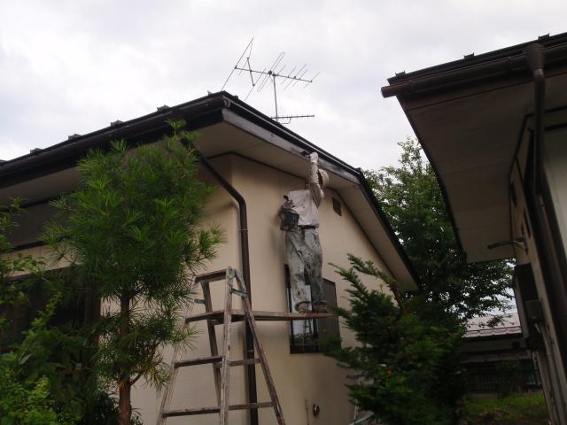 | 最後に玄関屋根の上も塗装して、ここから降ります。今日はここまで | かれこれ4日をかけて、3回塗りをします。 | 最後に、破風板や雨樋も塗装して終了です。 |