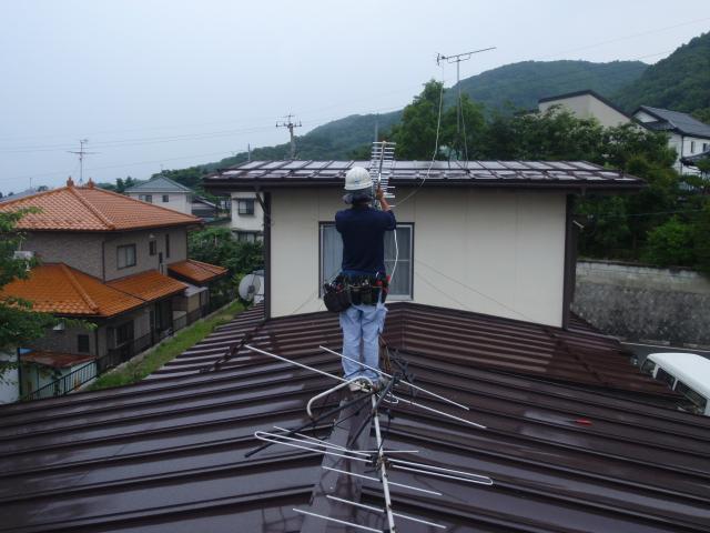 | 北側屋根の雪止めネットフェンスも設置しました。 | きれいに塗り仕上がりました。ツヤがきれいです。 | 追加で頼まれた、地デジ用アンテナの交換。 すべて終了、完成です。 |