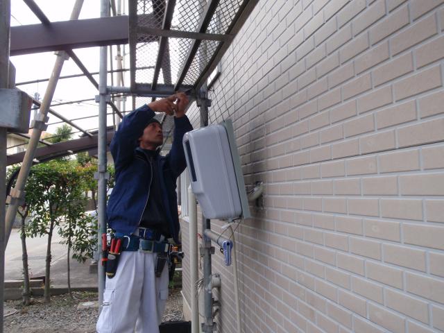 | まず既存のベランダを取り外します。 | 足場を掛け、シートも張ります。 | 電気のメーターや、雨樋、ベンドキャップも取り外します。 |