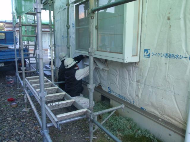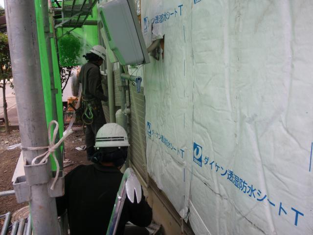 | サイディングを剥いで、ビックリ。通気工法になっていませんでした。 | 破れてしまったり、施工不良の箇所に防水紙を貼ります。 | それからk様にご説明をして、急遽木下地を打ち付けることに。これで、通気工法になります。 さあ来週からいよいよサイディング工事です。 |