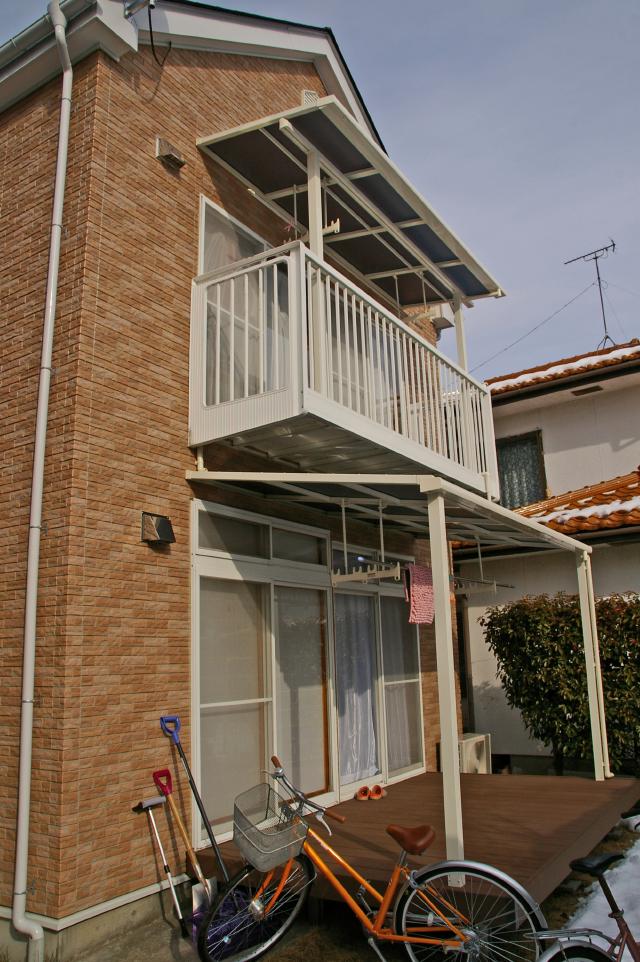 | 完成です。煉瓦調の外観がきれいです。 | ベランダや物干し用屋根が付いて、大変便利になりました。 | 1階のウッドデッキも完成です。 |