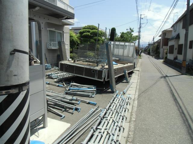 | まずは屋根など高い部分の作業に足場を架けます。とびさんに足場を作っていただきます。 | いろんな形の足場材や柱をどんどんと組み上げて生きます。 | 午後が過ぎて14時くらいにはすべてが終わりました、早いです。 |