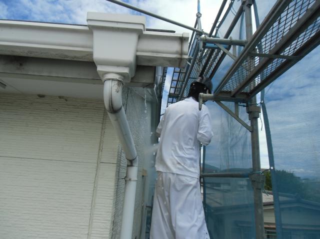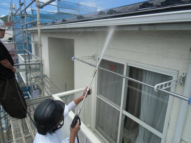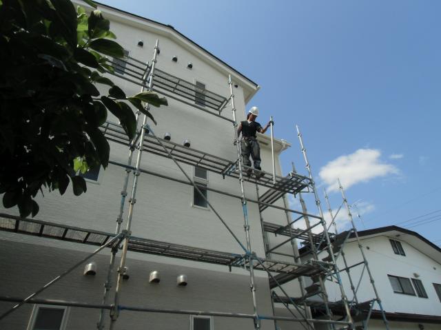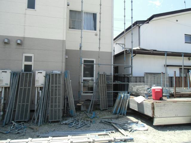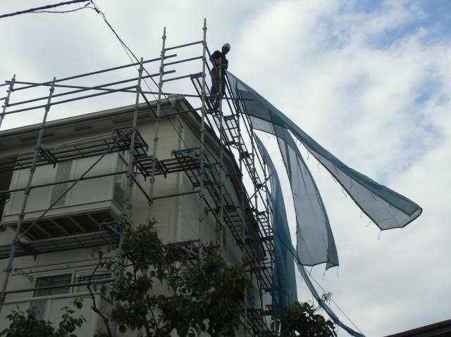| 後は粉塵などを防ぐためや飛来落下防止に養生シートを張っていきます。 | 足場ができて、塗装屋さんに高圧洗浄で洗いをしてもらいます。 | かなりの威力なので、絶対に手でふれてはいけません。 |