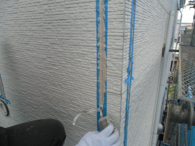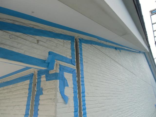 | 高圧洗浄が終わり、コーキング屋さんに目地のコーキングを打ち変えてもらいます。まず古くなったコーキングを撤去します。 | はがし終わったら、テープで養生をしていきます。 | 養生をしっかりやらないとコーキングが壁にべっとりと付いてしまうので、注意が必要です。 |