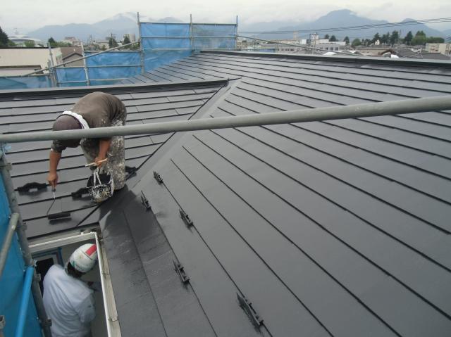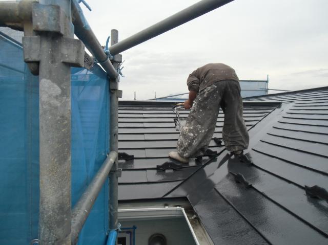 | コーキングを打ち変えている間に、塗装屋さんには屋根の塗装をしてもらいます。 | この日は曇っていただけで、雨は降らなかったので、塗装屋さんもコーキング屋さんも作業ができました。 | コーキングが打ち終わったら養生を剥がしていきます。 |