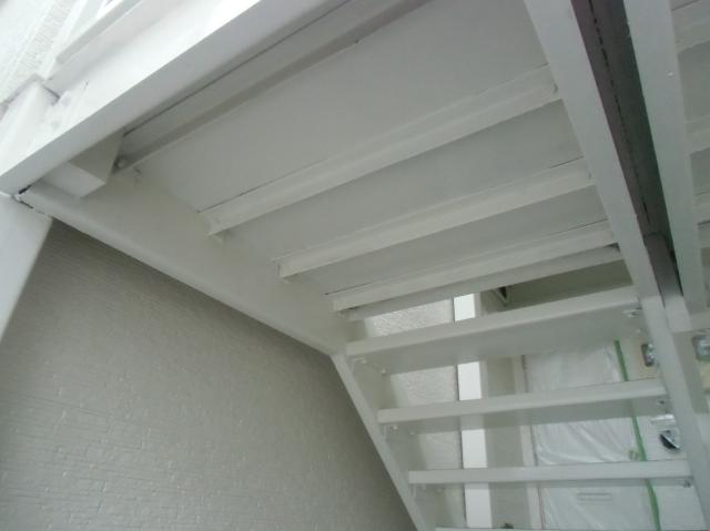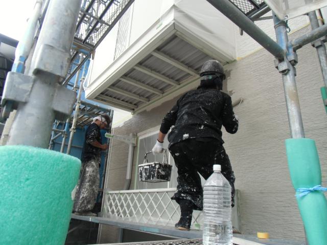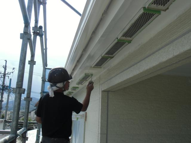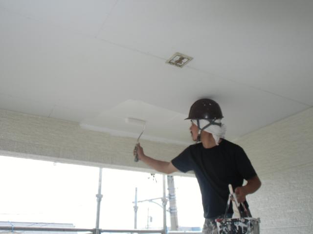| 階段室や軒天も塗装するので、床の養生をします。 | 階段室の天井を塗っていきます。下地塗りからやっていきます。 | 軒天も同じ工程で作業を進めます。下地、中塗り、仕上げの順番です。 |