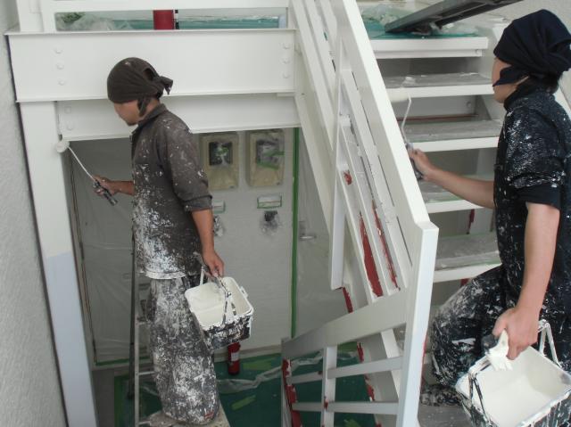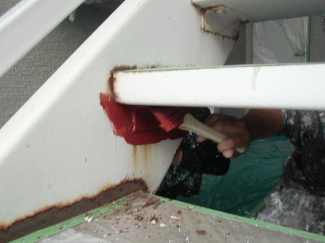 | 配色が違う壁も丁寧に塗っていきます。 | 壁をやり終えたら、階段の塗装を始めます。その前に錆止めを塗ります。 | 大きく錆びている箇所に丁寧に塗っていきます。 |