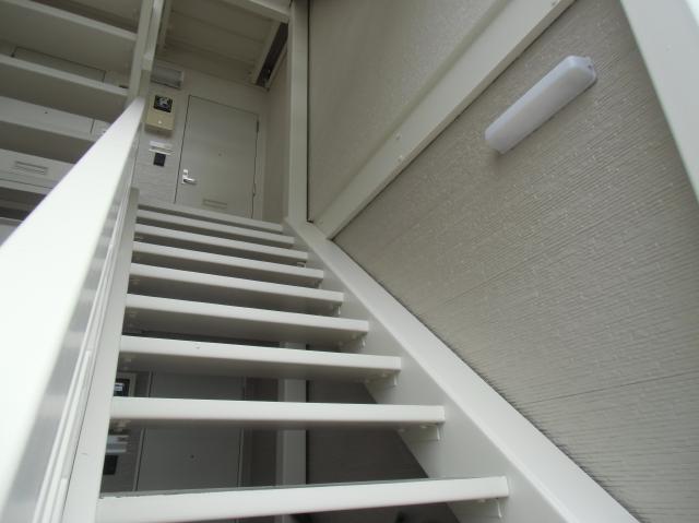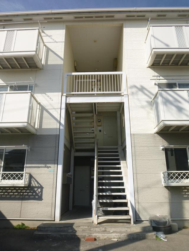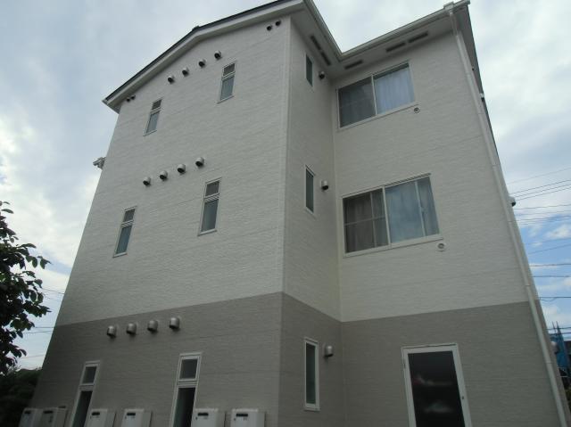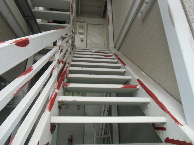 | 錆びていた階段はすべてに錆止めを塗り、真っ白の塗料で綺麗になりました。 | 裏側の塗装も終わり、養生も仮設もすべて取り、すっかり綺麗になりました。 | 正面玄関です。 正面も仮設をすべて取り払うと、綺麗に仕上がったことが分かります。 |