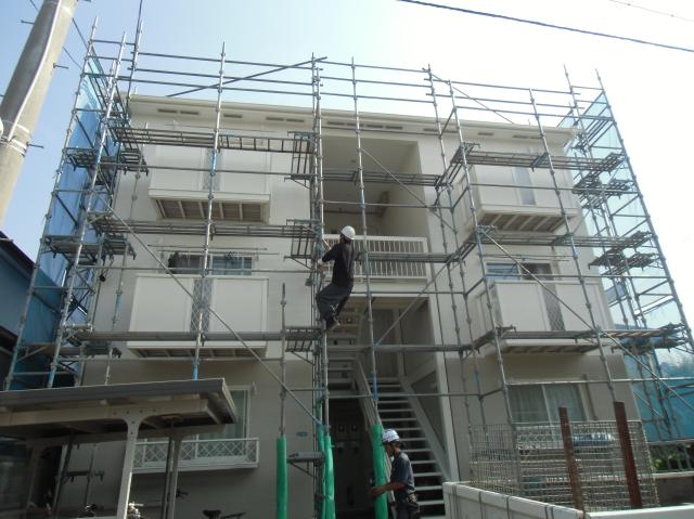 | 屋根の塗装をするのにも階段の塗装をするのにも、3階建てなので足場が必要になります。外壁の塗装や目地のコーキングの劣化も進んできているのがみうけられたので、せっかく足場を組むので、外壁のリフォームも一緒に提案させていただきました。 |