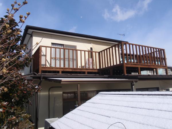 | 南側屋上のウッドデッキも塗装して完成です。 | 物置、エアコンも元通り戻して完成です。 | 柔らかなアイボリー色の、優しい感じの家になりました。 |