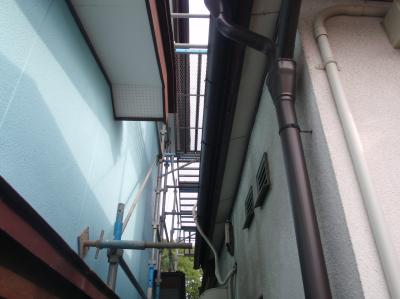 | 西隣は売り物件であった為、不動産会社様に連絡をして、足場を掛けさせて頂きました。 | 東隣はあまりに接近しているので、お願いして両方の家の屋根に足場を架けさせて頂きました。 | 足場を固定するためのふれ止めもお隣の家の壁に突かせて頂きました。 |
