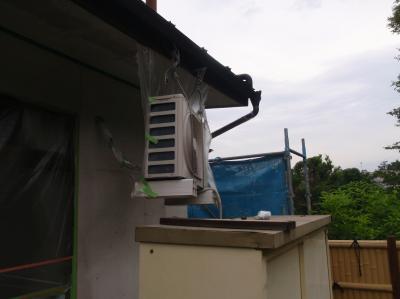 | 軒天、破風から塗装開始です。 | 物置の上に設置された室外機は、使用中のままつり上げ、物置を前に出します。 | 最後に、外壁の塗装をして、細かい部分を補修して完成です。 |