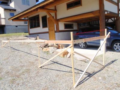 | まずは基礎工事用の丁張りを掛けます。 しっかりとした基礎を作らないと・・・ |