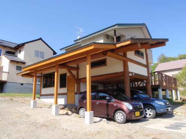 | 柱と下屋裏を廻りのログに合わせて塗装をして完成です。 | 最初から有ったような雰囲気で仕上がりました。 | 1m30cm程屋根が伸び、今年は駐車スペースまで雪が来ないのでは無いでしょうか。 |