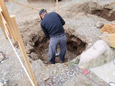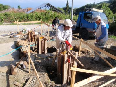 | 基礎工事開始、地面は固く、独立基礎とは言え重機を使わないと大変です。 | 転圧を十分おこない、その上に型枠をくみ上げます。 | コンクリート打設、一つ一つスコップで流し込みます。これがまた結構大変! |