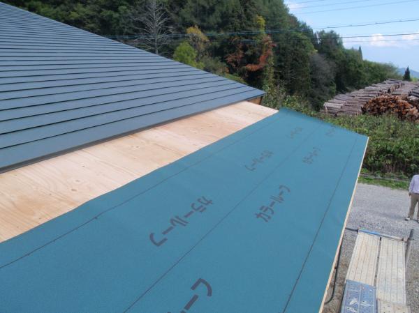 | 型枠を外して、整地 いよいよ建て方です。 | 既存屋根の勾配に合わせて屋根を掛けます。 | ルーフィングを敷き込み、カラー鉄板一文字葺きにて仕上げます。 |
