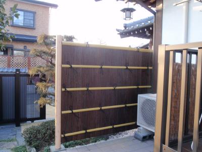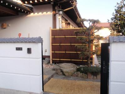 玄関門扉を閉めて、その向こうに桧皮垣が。 Y様は、余りに高級感があり、ご近所に恥ずかしいとのこと。 大丈夫、立派ですから。 |