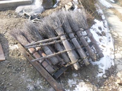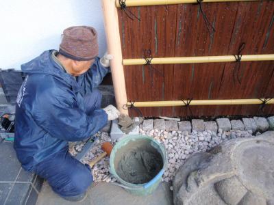 | 組み上がったパネル状にになった、垣根を、沓石に立て込みます。 | 最後に、笠の竹をかぶせ、また紐を縛り付けます。 | 足をモルタルで固めて、終了です。 |